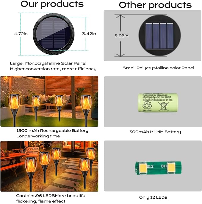 - Upgraded Solar Panel & Long Working Time: Equipped with a 2,200 mAh high-capacity battery and advanced monocrystalline silicon solar Panel, boasts an energy conversion rate of up to 19%, resulting in higher charging efficiency compared to other flame torch lights. Those flickering flame solar lighting lights up to 12 hours in summer and 5 hours in winter after fully charging. Charging time: 6-8 hours for sunny days.