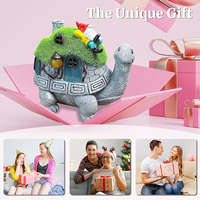 - The Turtle Cute: A charming turtle house solar light, featuring a luminous design, harmonizes with lush lawns and little gnome, transforming into a warm, delightful highlight at night, infusing gardens with playfulness and vitality. As a solar-powered garden decor, this cute turtle carried the gnome on his back, decorating gardens, patios, porches, and water features with creativity and charm.