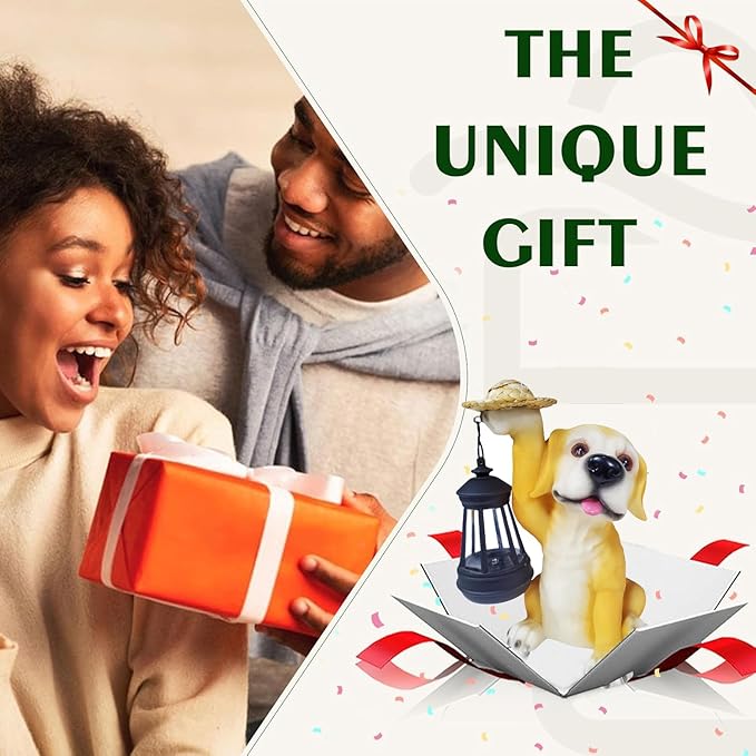 • Solar LED Lantern: These garden dog statues come with a built-in solar LED lantern that automatically illuminates at dusk. This energy-efficient lighting solution provides a warm, inviting glow to your outdoor space without the need for external power sources, enhancing your garden’s nighttime ambiance.