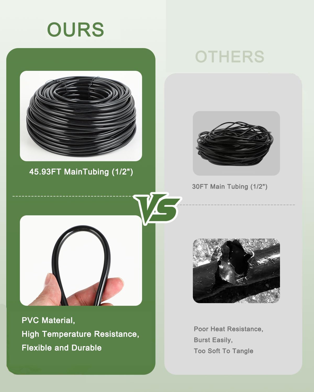 - 🌿 177FT Comprehensive Drip Irrigation Kit – Covers 300 Sq. Ft.: This high-efficiency micro drip irrigation system covers up to 300 square feet, ensuring consistent watering for all your plants in one go. Installation is effortless—no digging or plumbing skills required! The kit includes: 1 45.93ft 1/2 Inch Main Line + 1 131.23ft 1/4 Inch Distribution Line + 10 Drip Irrigation Emitters Vortex + 10 Drip Emitters Spray + 8 1/2 Inch to 1/4 Inch four way connector + 16 Nozzles + 16 Tee + Tubing End Plugs + Water Connector + 1 Instructions Guide.