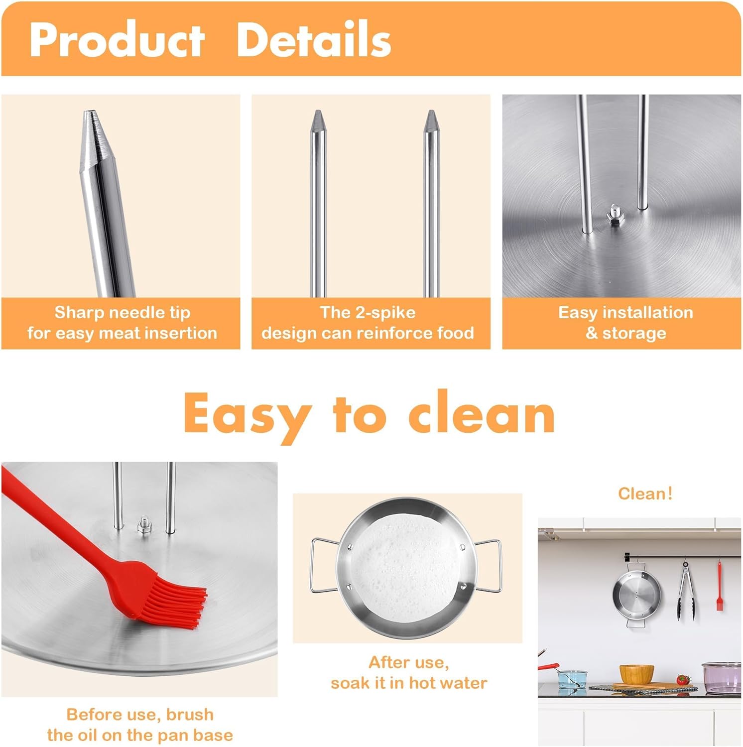 - Package includes: our Al pastor skewer for grill set includes a grill pan with handles measuring 12.8 inches/32.5 cm in diameter, 2 spikes measuring 10.2 inches/26 cm long each, 1 oil brush, 1 pair of tongs, and 1 screwdriver; the quantity and sizes are sufficient for you to apply and replace, and can easily meet your daily use and other requirements