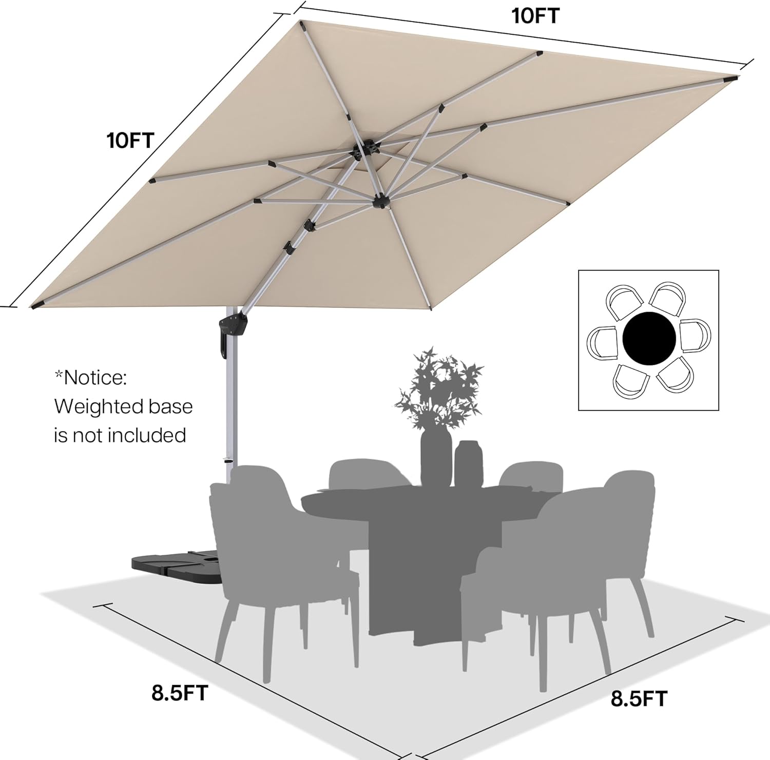- Overall Dimensions: 10 x 10FT. Please Note: Umbrella base sold separately. Perfect and essential for summer or sunny days to shade sunshine, apply to garden, deck, yard, pool, patio table and patio shops like cafe, restaurant, enjoy your time in the gentle breeze.