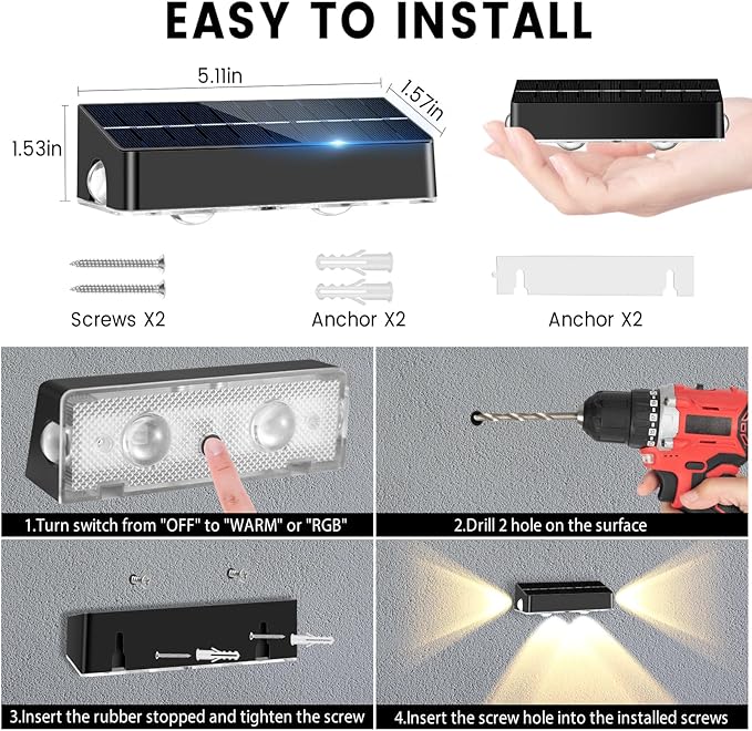 - Fast Charge&Long Last Lighting:Our outdoor solar wall lights use the premium monocrystalline silicon solar panel,which the efficiency of light energy conversion up to 22 %; the solar powered fence wall lights keep lighting from dusk to dawn after 4-5 hour full charge
