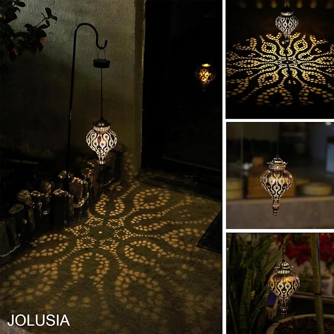 - *Hanging Solar Lanterns Outdoor Perfect Design*:JOLUSIA Morocco solar lights outdoor waterproof casting gorgeous, unique flower designs. solar lights for outside presenting a unique visual pleasure through careful design,use warm white LED lights,emits a soft, pleasant light.It's very beautiful,create a romantic atmosphere Perfect for decorating your garden.Size:5.6*5.6*10.2(22)inchs.