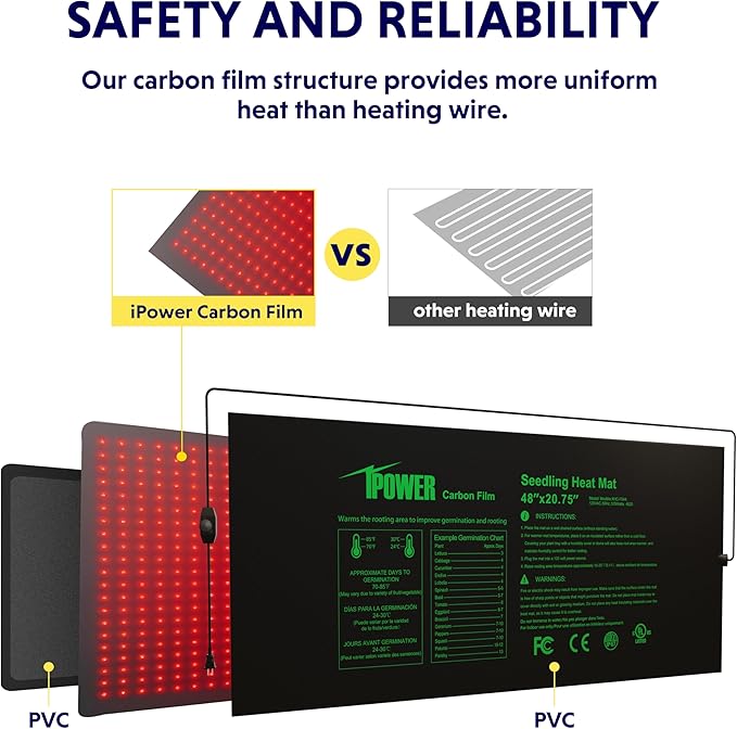 - Heating film structure: heating film ensure uniform heating. Warms root area 10-20℉ (5-11℃) over the ambient air temperature, which will increase the success of seedlings and cuttings