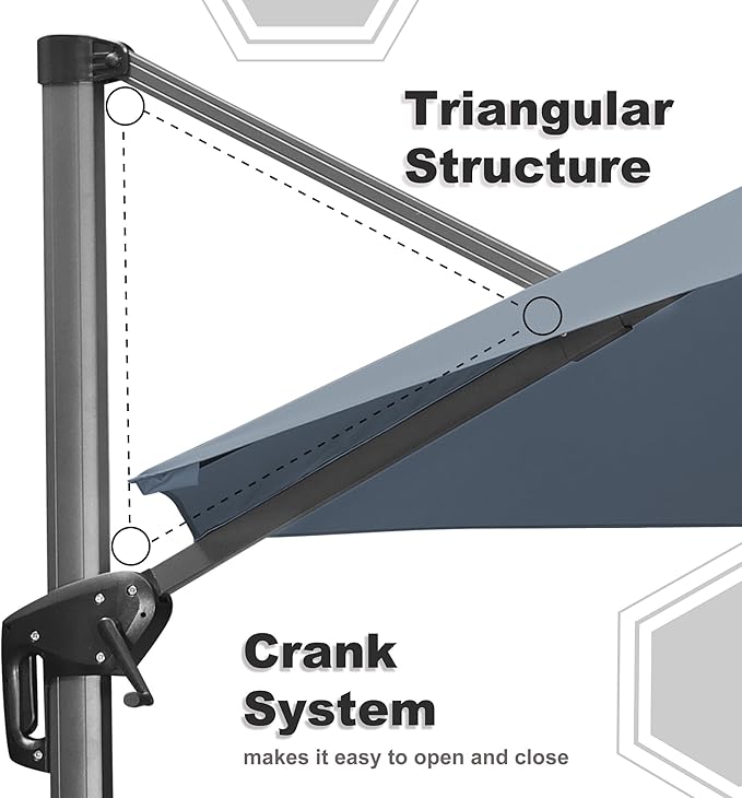 - The crank system of this cantilever umbrella makes it easy to raise and lower the canopy, the unique handle design also makes tilting the umbrella effortless, foot pedal allows for complete 360 degree rotation