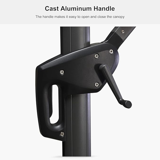 - The crank system of this cantilever umbrella makes it easy to raise and lower the canopy, the unique handle design also makes tilting the umbrella effortless, foot pedal allows for complete 360 degree rotation