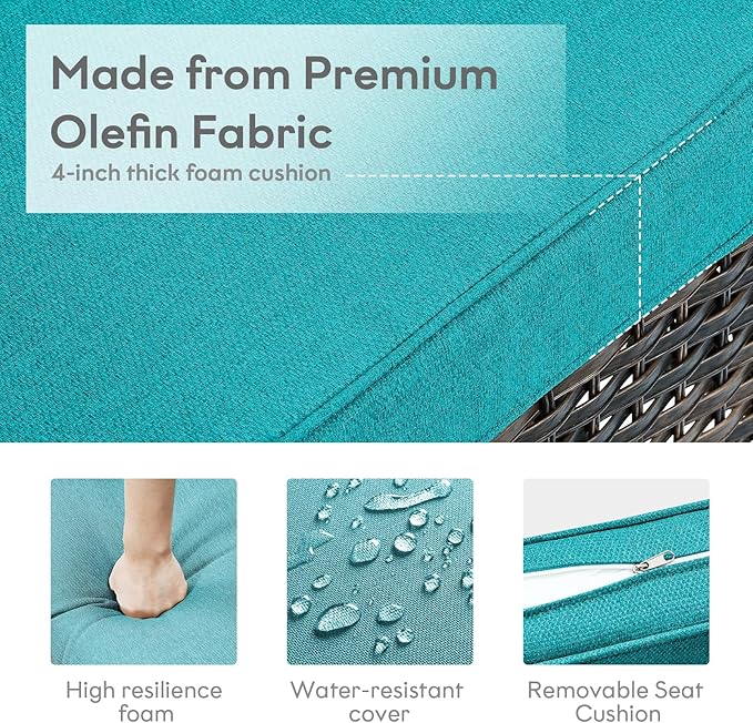 - 4.Comfortable And Easy To Clean: Both chairs in this outdoor patio set are equipped with 4-inch thick foam seat cushion and 8-inch thick cotton back cushion, which is ergonomic and improves the overall comfort of the wicker chair. The patio chair cushion covers are made of outdoor specialty olefin fabric that is water resistant, and each cushion is equipped with zippers that are removable and easy to clean.