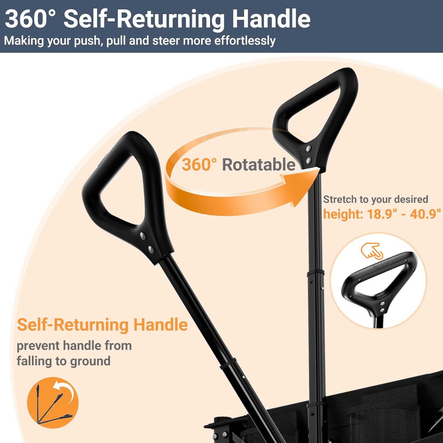 - 【All-Terrain Wheels with Brake & Adjustable Handle】 - The folding wagon comes with two front 360° swiveling off-road wheels that have brakes, ensuring a smooth pull and easy transport on most kinds of ground surfaces like the cobbled road, asphalt, dust, and grass. The adjustable handle features rebound function will not drop to the ground, no need to bend down and pull up the handle!