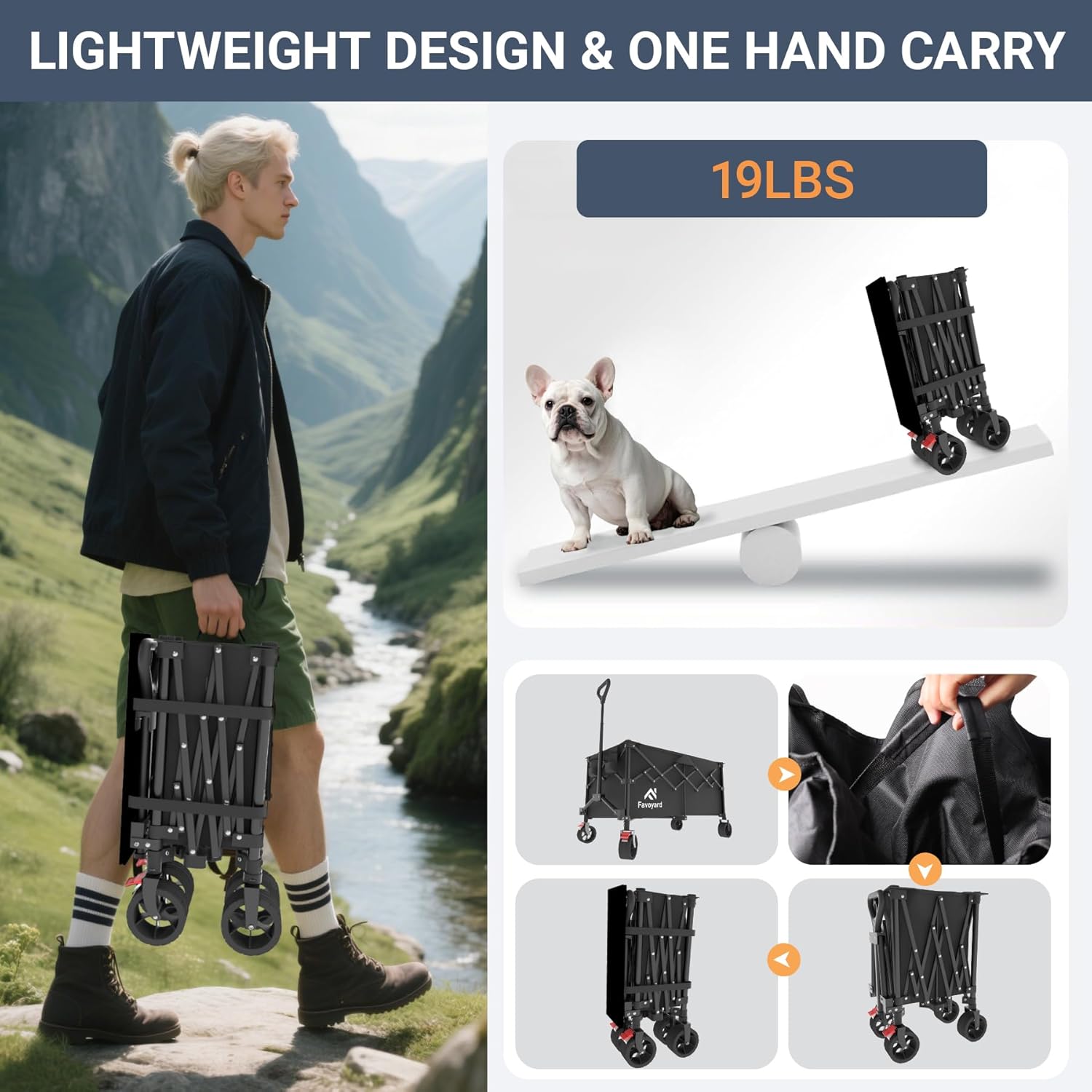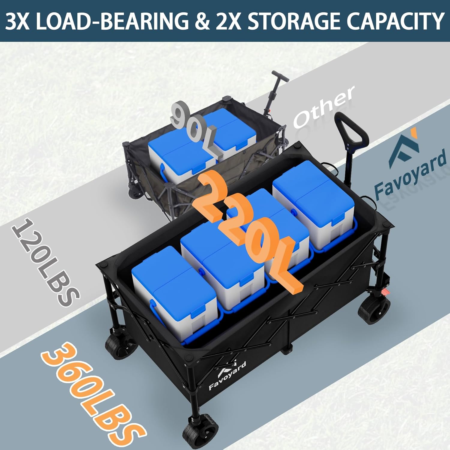 - 【220L Storage Capacity, 3x Others】 - In comparison to standard-sized wagons, the Favoyard collapsible wagon features much deeper and longer storage space. With a generous 220L storage capacity, it can accommodate all of your items with ease. Enjoy this wagons carts foldable for outdoor life such as grocery, shopping, gardening, camping, picnic, sporting events, and can also be used as a dog wagon.