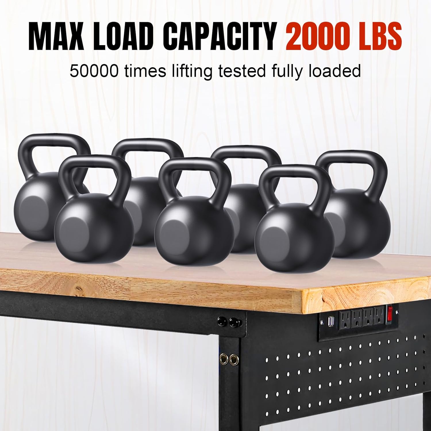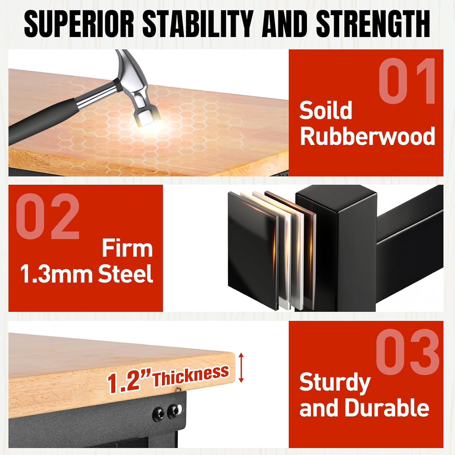 - PLEASE RECOGNIZE THE MUWOOD BRAND WHEN PURCHASING! SOLID RUBBER WOOD AND THICK STEEL: The tabletop is made of 66“ x 22” x 1.2” solid rubber wood. It is finely coated and polished for long life and easy cleaning. The steel is 1.3mm thick.Precision cutting process makes this workbench with 2000LBS weight capacity, ideal for auto repair projects and gardening.