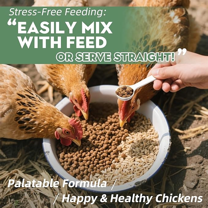 • Ease of Use: Mix with feed, 1 small tablespoon for 4 chickens. Adults: 1 gram/day. Chicks: 0.5 grams/day. Continue for 10 days, feeding once daily for best results
