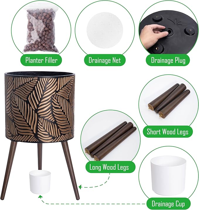 • What’s included: planter pot with drainage hole, drainage plug, set of 2 stand (3 long wooden legs & 3 short wooden legs).