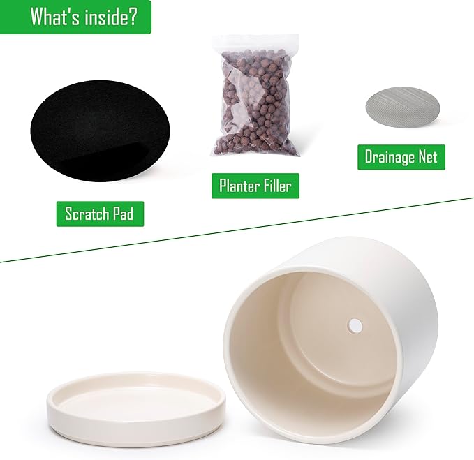 • Planter pot with drainage hole, mesh drainage net and protective scratch pad included.