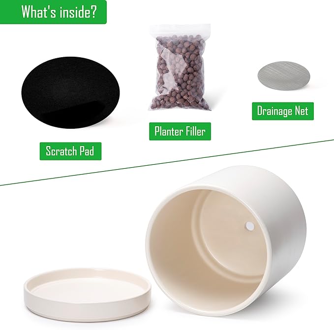 - Planter pot with drainage hole, mesh drainage net and protective scratch pad included.