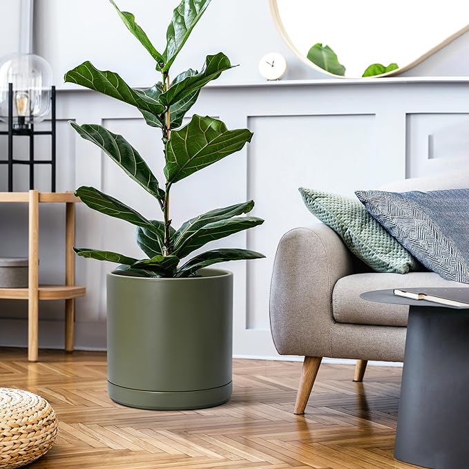 D'vine Dev 12 Inch Ceramic Planter Pot with Drainage Hole and Saucer, Indoor Cylinder Round Planter Pot, Olive, 94-O-F-J