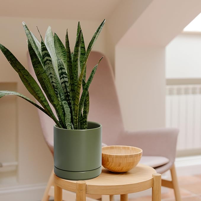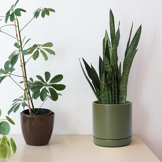 D'vine Dev 6 Inch Ceramic Planter Pot with Drainage Hole and Saucer, Indoor Cylinder Round Planter Pot, Olive, 94-O-C-J