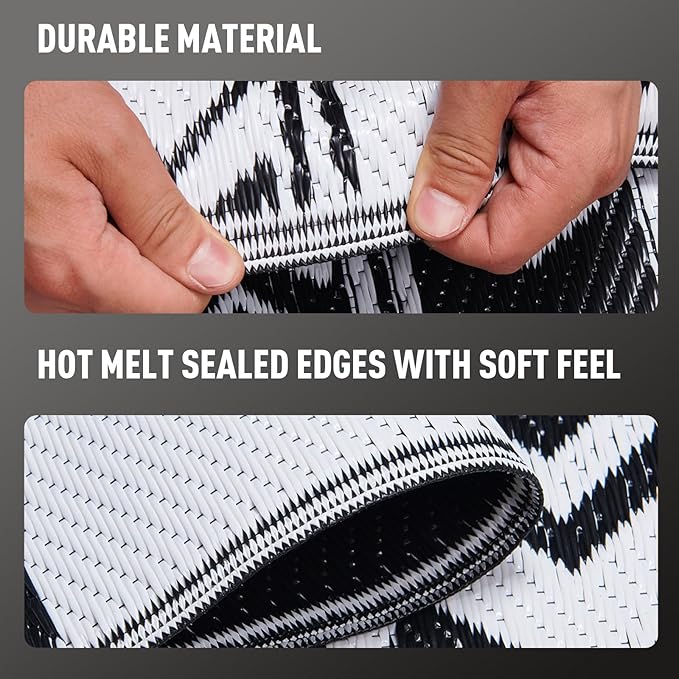 • Portable & Durable: This outdoor plastic rug with seams can be rolled or folded into a compact size and comes with a carrying bag for easy portability. Perfect for outdoor activities, picnics, sunbathing, and RV road trips. The heat-sealed edges prevent wear and tear, withstanding any environment, traffic, or scratches