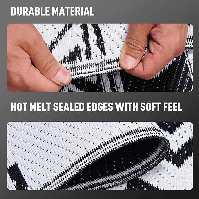 • Portable & Durable: This outdoor plastic rug with seams can be rolled or folded into a compact size and comes with a carrying bag for easy portability. Perfect for outdoor activities, picnics, sunbathing, and RV road trips. The heat-sealed edges prevent wear and tear, withstanding any environment, traffic, or scratches