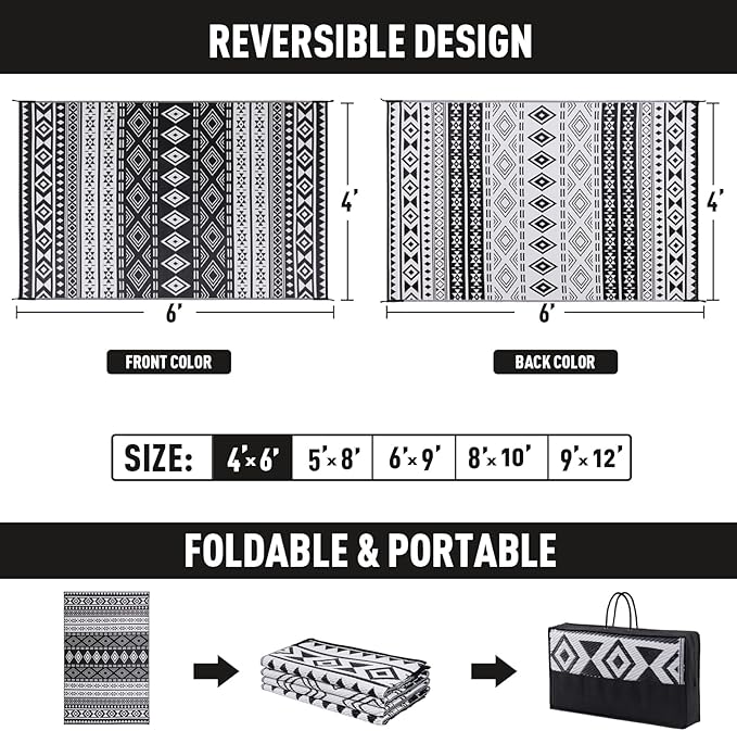 • Reversible Design: This double-sided patio rug features beautiful patterns on both sides, allowing you to quickly flip it over and instantly refresh your patio, porch, backyard, deck, RV campsite, or any outdoor space. A simple way to transform your style effortlessly