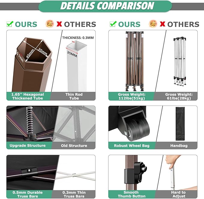 - [Upgrade Heavy Duty Canopy] The COBIZI 10x20 Heavy Duty Canopy features a commercial-grade full truss structure constructed from durable powder-coated stainless steel. The thickness of the 1.77 inch (45mm) hexagonal legs has been increased to 0.7mm/0.03 inches, providing superior stability and durability. Full truss design ensures exceptional sturdiness and rust resistance, capable of withstanding wind speeds of up to 30mph when properly secured with an number of sandbags, ropes, and stakes.