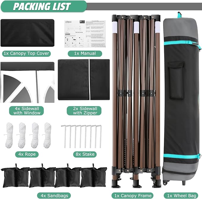 - [Included Accessories] 1x Commercial Grade 10x20 Pop Up Tent Frame, 1x Top Cover, 4x 420D Oxford Fabric PVC Coated Sandbags, 8 x Ground Pegs, 4x Windproof Ropes, 1x Rolling Bags, 1x Manual.If you have some problems and questions, please feel free to contact us, we will give you the best help. Choosing us means choosing a comfortable life.