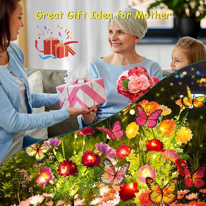 - 【2025 Latest & Unique Solar Butterfly Lights】- 3 Pack of swaying butterfly solar flower lights are unique and innovative design for your one-of-a-kind outdoor decor experience. Each solar flowers bouquet has 3 swaying butterfly lights and 7 glowing snow lotus flowers lights, a total of 30 beautiful blooming garden lights! As night falls, watch the butterflies and fireflies dance among the flowers, creating a captivating display and charming ambiance for your yard decor.