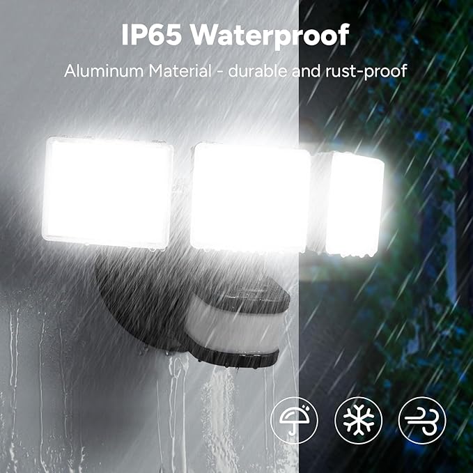 - 【IP65 Waterproof and Durable Material】The sensor lights for outside have passed the rigorous testing of IP65 waterproof to resist rain, snow and dust. Made of aluminum and polycarbonate material, the security light also has excellent performance of heat dissipation, high-temperature resistance, frost resistance, anti-UV and anti-breakage, suitable for outdoor weather.