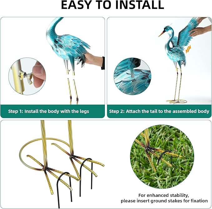 36.75" Metal Crane Garden Statue - Handmade Oversize Heron Sculptures with Stable Ground Stakes, Backyard Large Bird Decoration, Metal Garden Art.