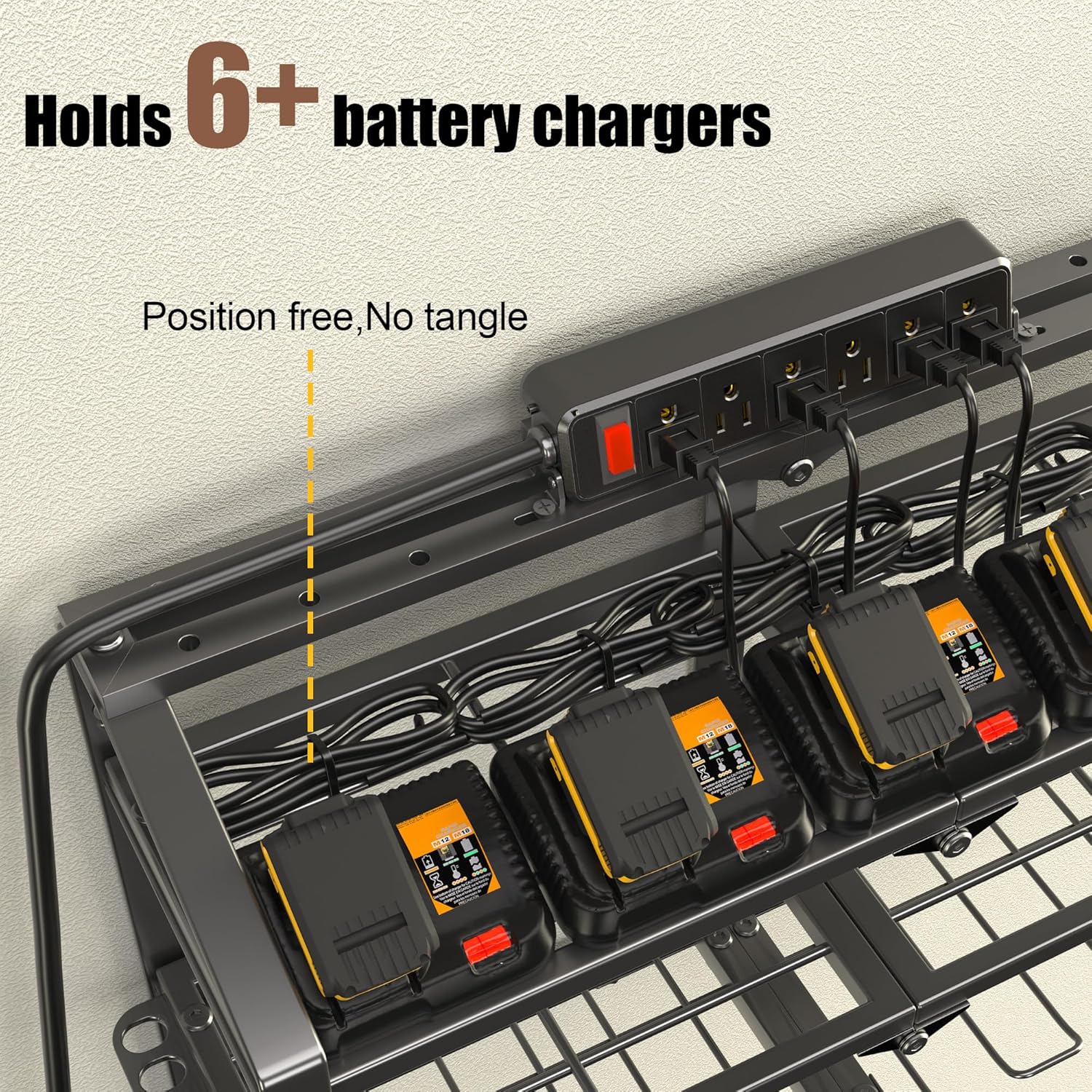 - Built-in 6-Outlet Power Strip: The Spampur Power Tool Organizer with Charging Station charges up to 6 power tools simultaneously. Features an angled panel for easy-access plugging. Mounted 3.2" above mesh shelf for space efficiency.