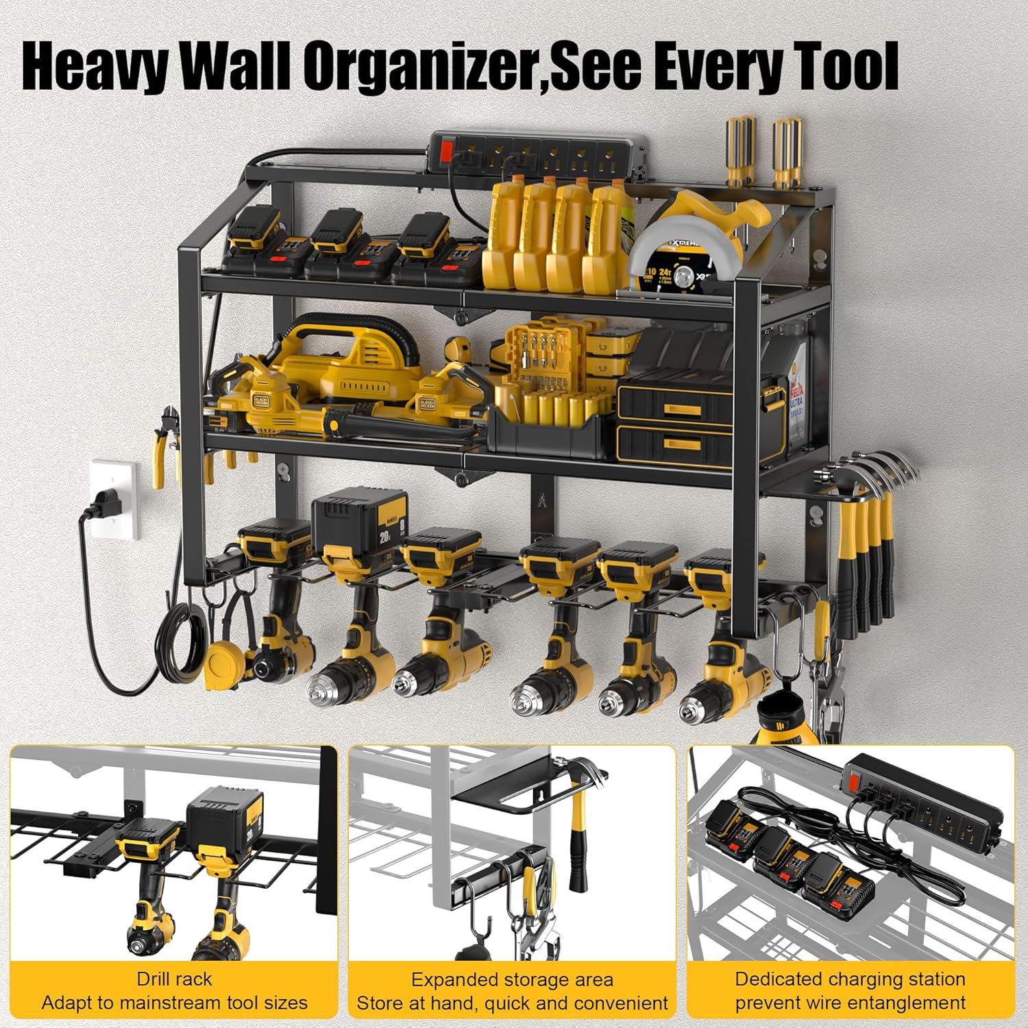 - Professional Tool Storage Solution: SPAMPUR organizer transforms wasted wall space into a compact, efficient area. Multi-tier design stores power/hand tools centrally—all-in-one storage for drills, chargers, batteries and toolboxes. Optimize workspace with tools within arm's reach.