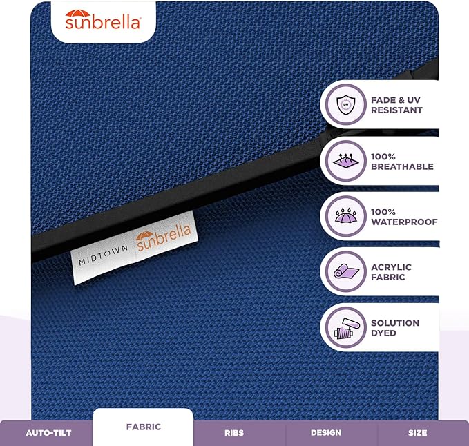 Midtown Umbrellas Sunbrella Umbrella 8 Feet Outdoor Umbrella With Sunbrella Dark Blue Acrylic Fabric - Auto-Tilt Aluminum Frame Patio Umbrella For Backyard, Deck, Garden, Pool - Black Pole
