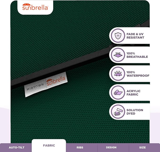Midtown Umbrellas Sunbrella Umbrella 9 Feet Outdoor Umbrella With Forest Green Acrylic Fabric - Auto-Tilt Aluminum Frame Patio Umbrella For Backyard, Deck, Garden, Pool - Black Pole
