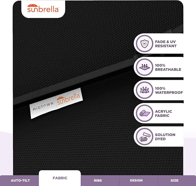 Midtown Umbrellas Sunbrella Umbrella 10 Feet Large Outdoor Umbrella With Sunbrella Black Acrylic Fabric - Auto-Tilt Aluminum Frame Large Patio Umbrella For Backyard, Deck, Garden, Pool - Black Pole