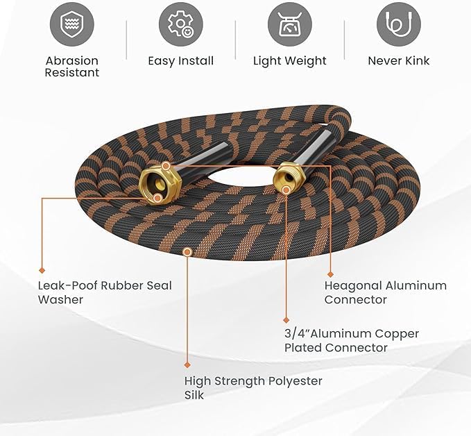 - Aluminum Connector: The garden hose is equipped with Hexagonal 3/4-inch American connector and rubber gasket design to prevent leakage, has excellent corrosion resistance and does not rust