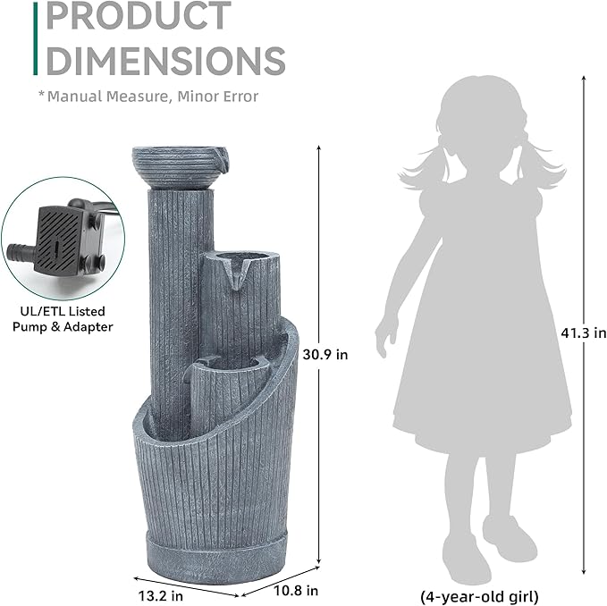 - Easy & Safe Use🔌: This freestanding floor water fountain Includes a certified ETL/UL-listed pump and a standard 6ft power cord. Quick and easy setup—just add water, plug it in, and enjoy. Designed for safe outdoor use, backed by a 1-year manufacturer’s warranty for added peace of mind.