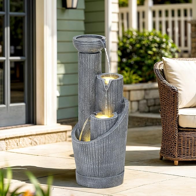 - Modern Minimalist Outdoor Fountain⛲: Showcasing a bold 5-tier geometric pedestal design with a graceful twist, this outdoor water fountain combines clean lines with a handcrafted concrete-style finish and fluted textures. Standing 31" tall, it serves as a striking focal point that brings sleek modern style and peaceful ambiance to any garden, patio, deck, or backyard.