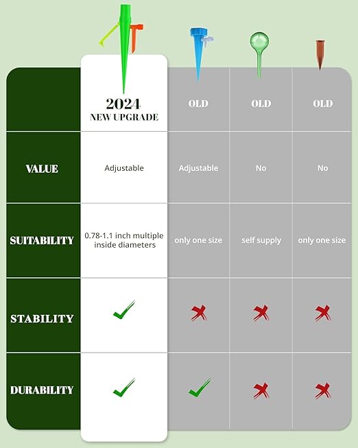 - Economical & Efficient: Get 12 Self Watering Spikes set—water multiple plants simultaneously for less. Traditional glass watering bulbs cost $15+ for a 4-pack. Our redesigned Self Watering Spikes fix previous flaws while offering superior value. No complicated setup—just plug, play, and save.