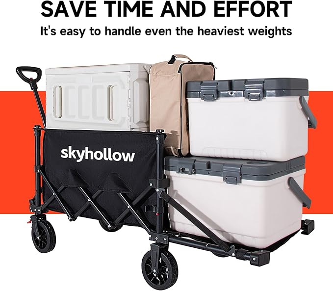 - 【Camping wagon & Beach wagon cart】When you consider all the equipment you carry on the beach or outdoors, the utility wagon can help you transfer all the goods from your arms to a sturdy carriage, making it easier for you. This is an excellent choice for outdoor activities and can also be used for carrying groceries, fishing, sports equipment, or camping gear.