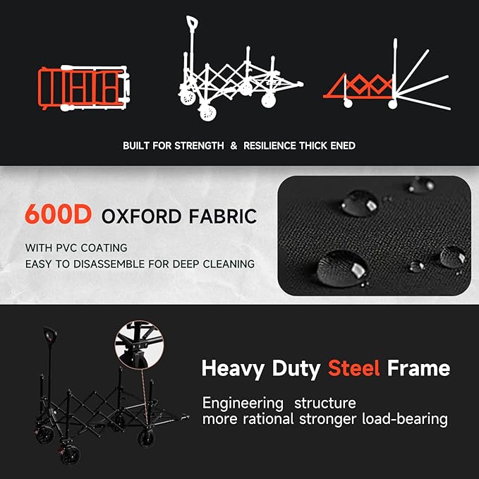 - 【 High quality materials 】 The heavy duty garden wagon cart is made of high-quality alloy steel, with a sturdy frame structure that can carry more weight. It is made of detachable 600D Oxford canvas that is waterproof, easy to clean, and durable. The dynamic load capacity is 220 pounds, and the static load capacity is 350 pounds