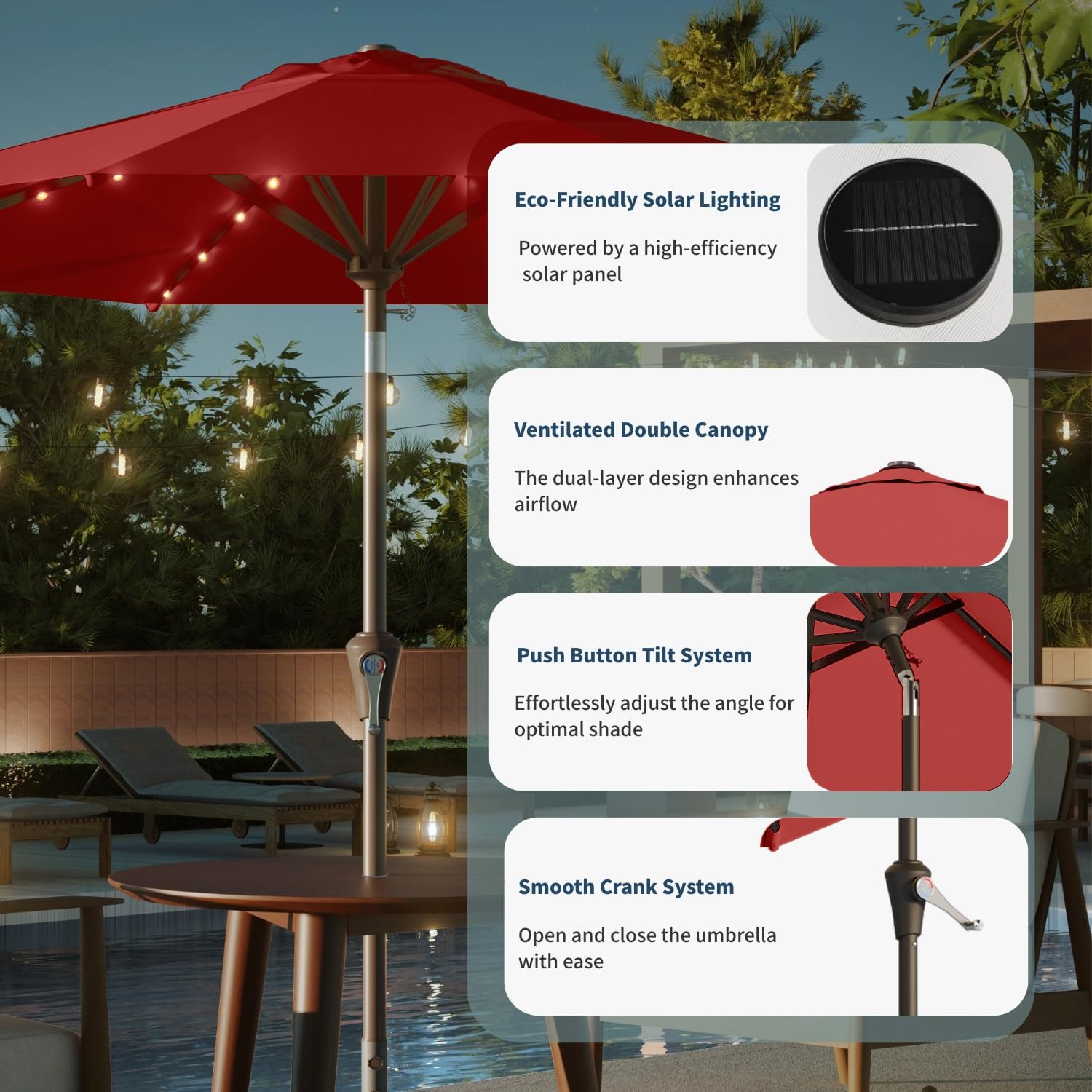 9FT Solar Umbrella 32 LED Lighted Patio Umbrella Table Market Umbrella w/Tilt and Crank, UV-Resistant Outdoor Umbrella for Pool, Garden, Deck, Red