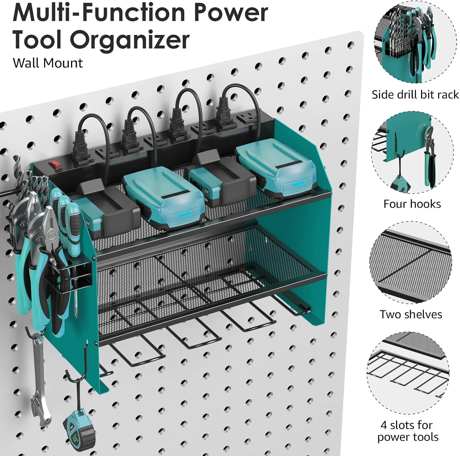 - Wall mount power tools organizer come with 4 slots, 4 hooks and drill bit rack, built-in power strip, double layer structure can keep rechargeable tools organized in the work area and save your bench space. The tools in the picture are for demonstration purposes only and are not included.