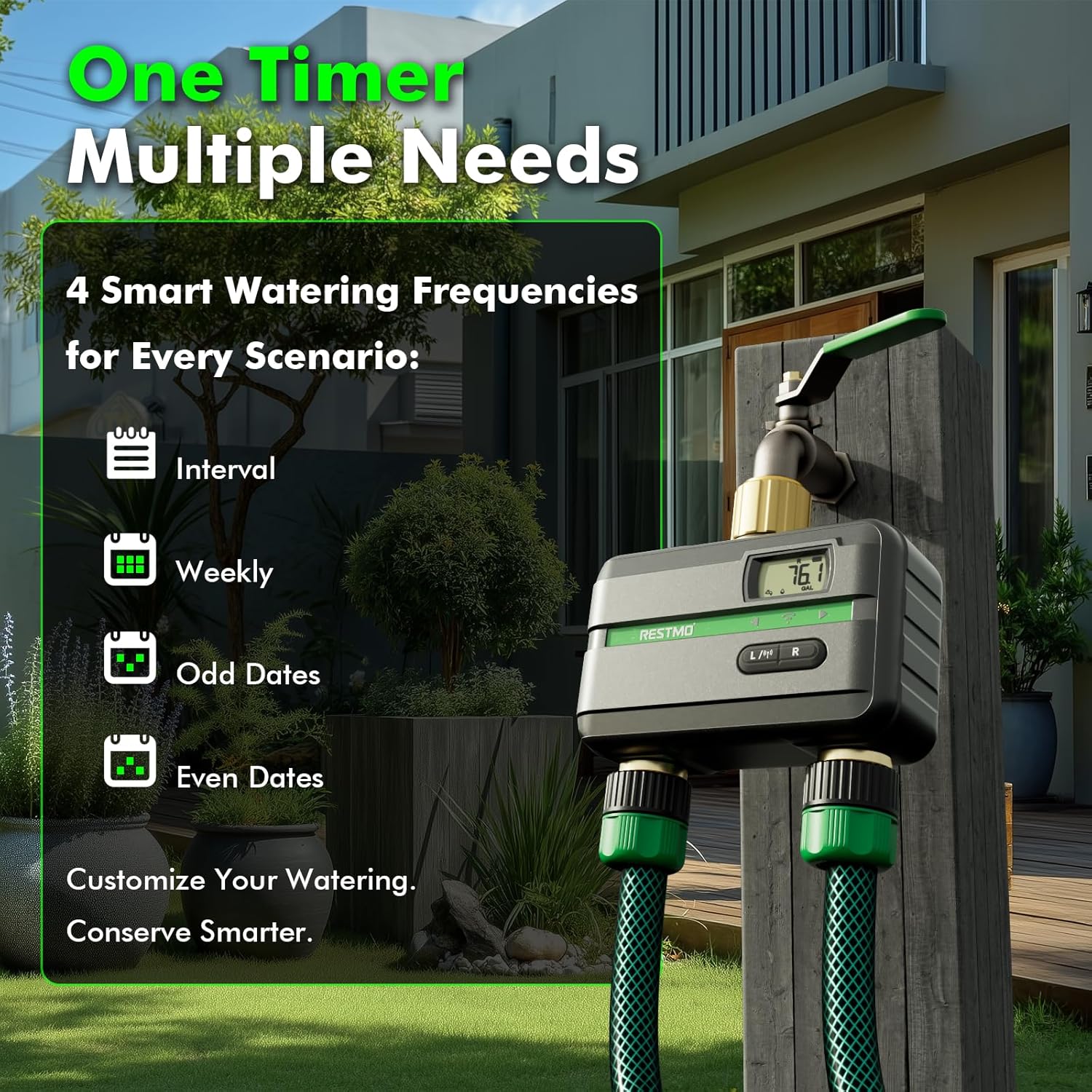 - 【Dual-Zone Independent Control】Designed with 2 independent outlets, this timer allows you to set separate schedules for two different zones. Whether you're watering the front lawn and backyard garden or two types of plants with different needs, each zone can run its own customized plan—perfect for maximizing efficiency and coverage with one device.