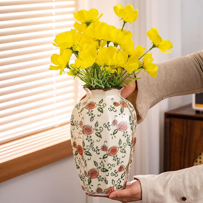 - ELEGANT PASTORAL DESIGN: The SURE YUESI hand-painted red rose pastoral vase features a stunning green and beige crackle glaze finish, blending rustic charm with vintage elegance. Its unique octagonal shape and floral motif make it a perfect centerpiece for farmhouse, Tuscan, or grand millennial home decor styles.