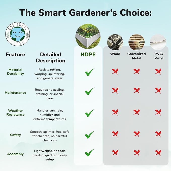 - SAFE, ECO-FRIENDLY GARDENING: Made from non-toxic, BPA-free plastic, this raised bed is 100% recyclable, offering a sustainable option for growing your herbs, vegetables, and flowers. Enjoy peace of mind knowing your garden is safe for both plants and the planet.