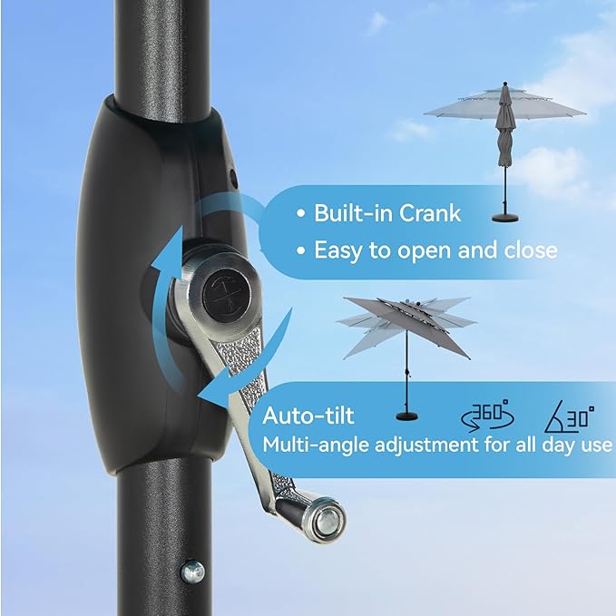 - 【Convenient Crank & Tilt System Table Umbrella】This outdoor umbrella is designed with crank open system for easy and quick use,The Auto tilt for all day use,for more angles of shading, keeping away from the hot sunlight. Ideal for both residential and commercial locations