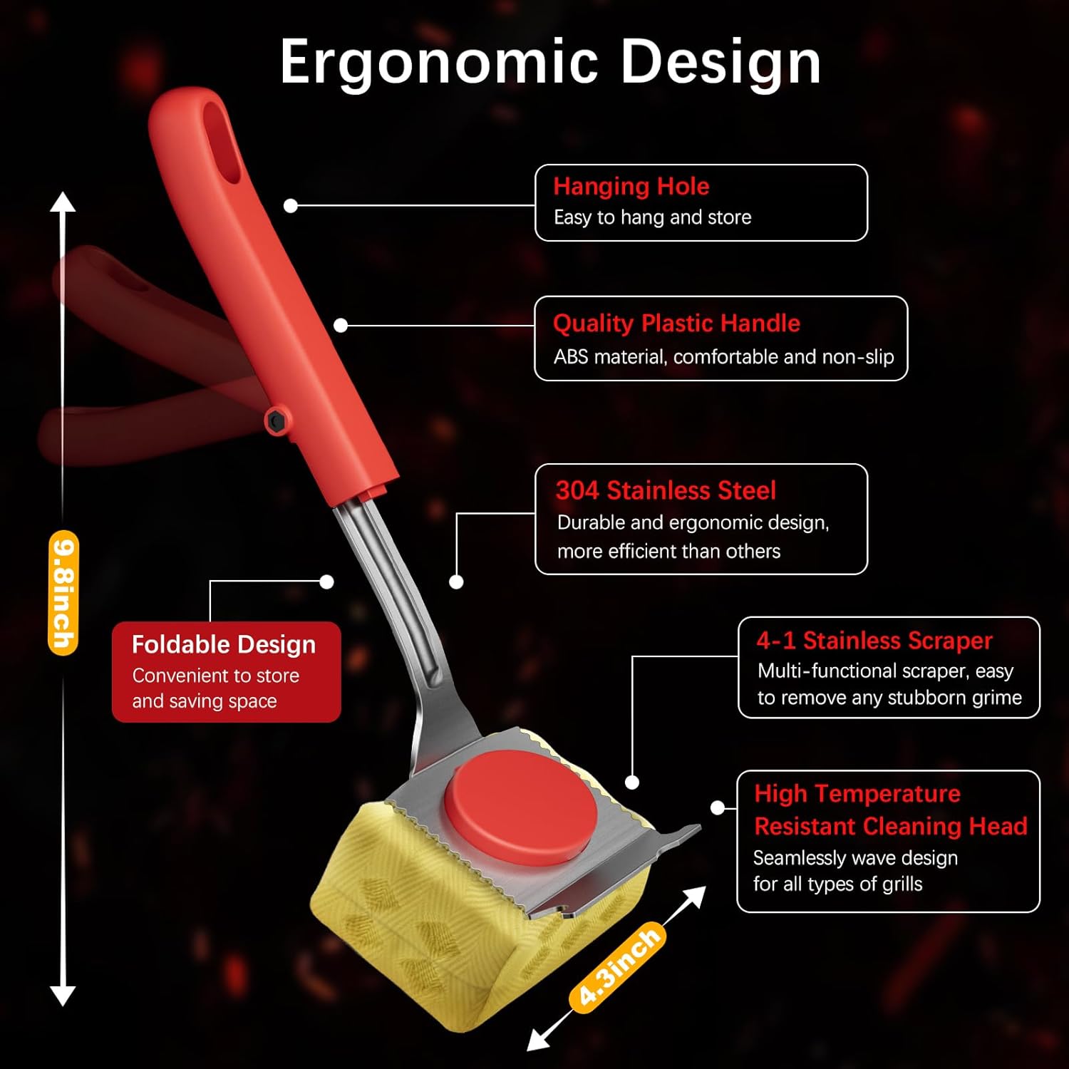 - 【𝐈𝐧𝐝𝐮𝐬𝐭𝐫𝐢𝐚𝐥-𝐆𝐫𝐚𝐝𝐞 𝐃𝐮𝐫𝐚𝐛𝐢𝐥𝐢𝐭𝐲】 Military-spec components: anti-rust stainless steel withstands 1600°F direct flame contact. High temperature resistant textured ribbed sponge head - lasts more than3 grilling seasons (Lab tested: 500+ clean cycles). Tough plastic handle protects your hands from burning. Come with an extra dishwasher safe sponge replacement, easy to assemble and straight forward to use.