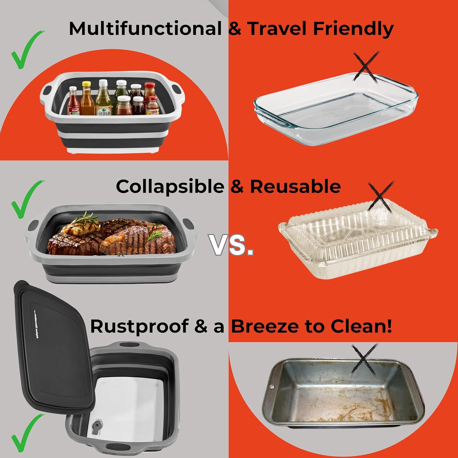 - 3-in-1 BBQ Prep Tub + Lid β Transforms into a wash basin, marinade tub, or light-duty cutting board. Fully collapsed form doubles as a serving tray.
