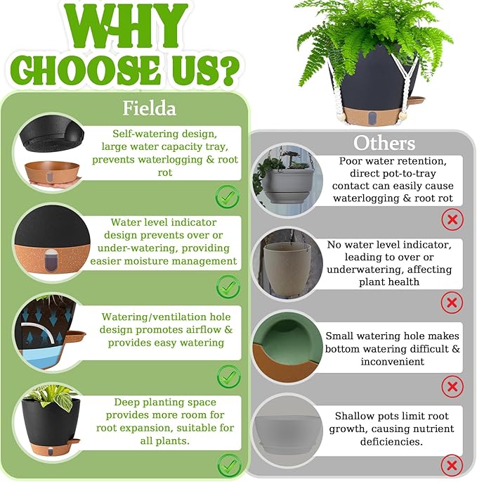 - 【Never Over/Underwater Again!】Fielda's indoor hanging planters feature an EXCLUSIVE WATER WINDOW in the base tray - instantly check moisture levels without guesswork! Protect your plants from dehydration and promote healthy root systems with this visual watering guide. Perfect for hanging pots for indoor plants enthusiasts who value scientific plant care.
