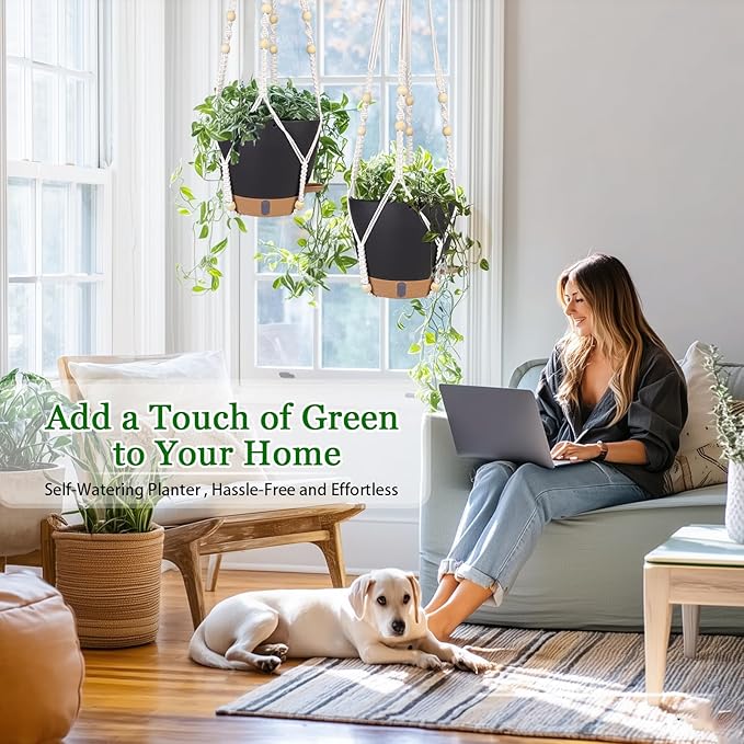 - 【Smart Self-Watering System】 Our hanging plant pots come with a REMOVABLE RESERVOIR TRAY that stores 7-10 day water supply. Absorbent cotton ropes automatically deliver moisture to soil when needed - ideal for vacations or busy lifestyles. Spend less time watering hanging baskets for indoor plants!